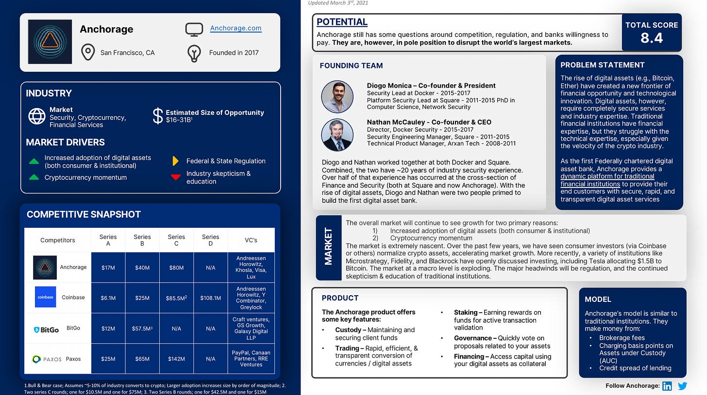 Anchorage checks all of the boxes. First to market. Technical expertise. Strong venture backing and partners. Exploding market. Overall, there are many competitive players, but the space is large enough for 2-3 players to capture significant share. As long as crypto adoption continues, Anchorage is a rocket ship that is never returning to earth.