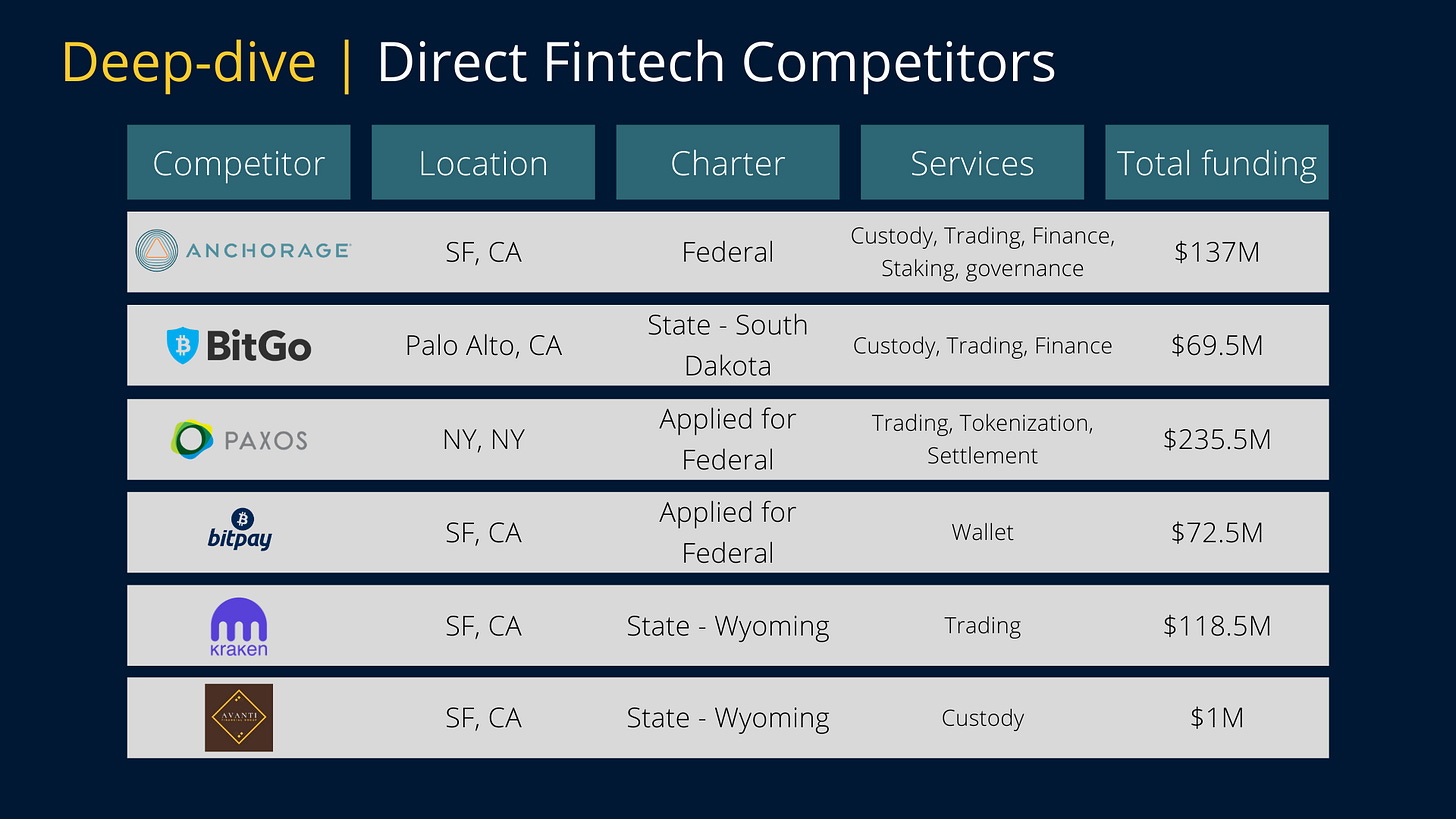 Paxos – Most formidable competitor; Significant Series C funding; Applied for Federal charter; Focused on provided a digital asset bank platform; Less emphasis on staking, governance, and financing at this moment