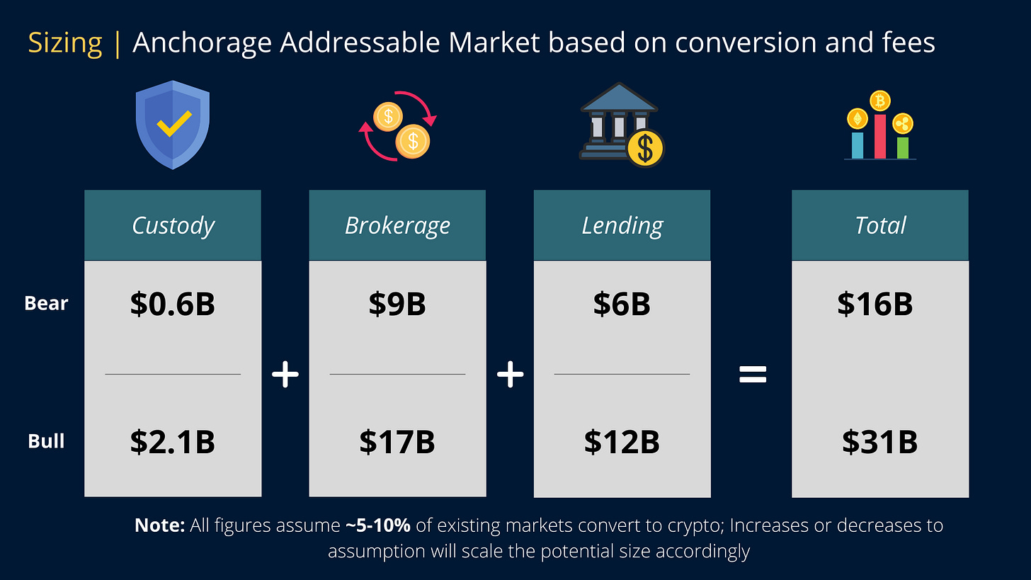Looking at moderate assumptions of adoption, fees, and market sizes, the TAM for Anchorage is ~$11-21B. A few high-level insights: