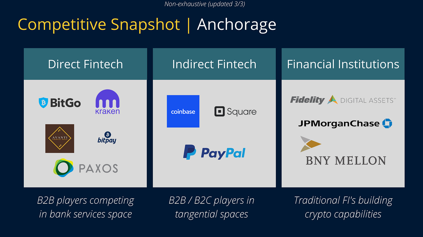 The three main players in this space pose an interesting potential partner and competitor dynamic. All three provide retail investors with access to crypto, but as shown recently, Coinbase helped Tesla acquire large scale of Bitcoin. Likely, I think these three stick to their core business, and they partner with a chartered bank like Anchorage to execute traditional financial institutions, but there is a world where one of these companies migrates up the chain and competes directly with Anchorage. I see this as the biggest threat.